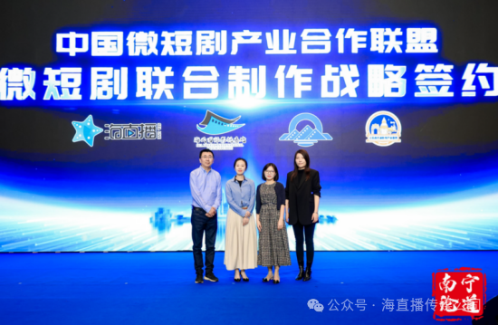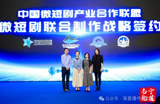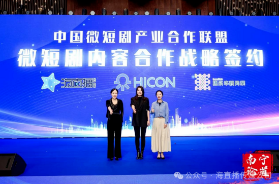 海直播传媒总裁崔聪、海直播传媒总经理张靖分别上台与联盟合作成员代表进行了微短剧联合制作、内容制作签约仪式。