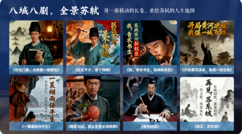该系列聚焦于苏轼等彪炳史册的文化巨匠。通过AI情感建模与外貌复刻技术,不仅精准还原历史人物的形象与风骨,更深入挖掘其内心世界,让观众得以穿越时空,与先贤进行一场跨越千年的对话。