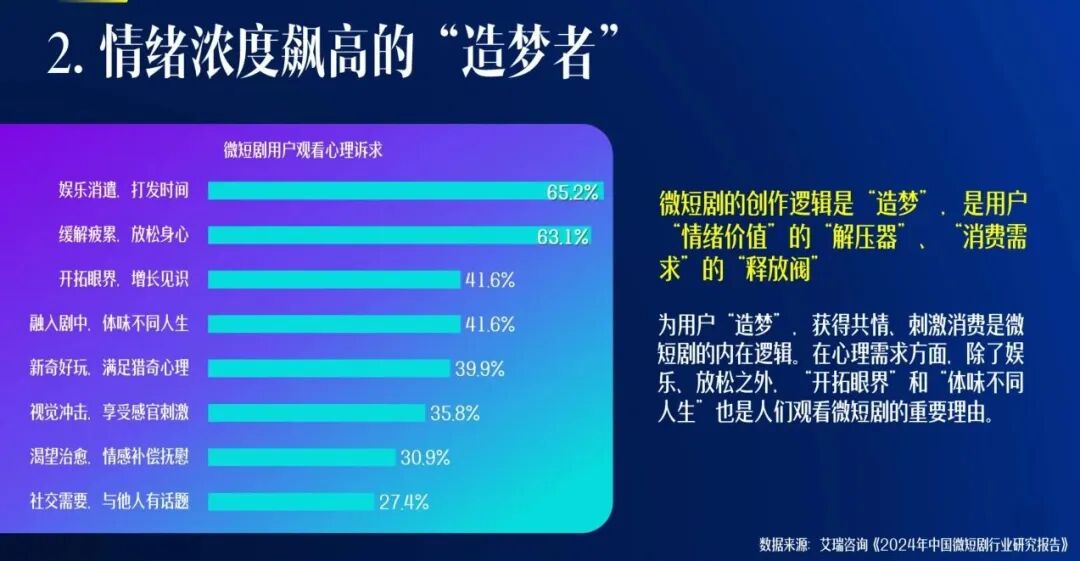 微短剧不仅是娱乐消遣的工具,更是用户情感需求的寄托。观众观看微短剧的心理诉求多样,除了娱乐放松,还希望通过短剧开拓眼界、增长见识、融入剧中体验不同人生。微短剧通过精彩的剧情和生动的表演,为用户 “造梦”,成为了用户 “情绪价值” 的 “解压器” 和 “消费需求” 的 “释放阀”。