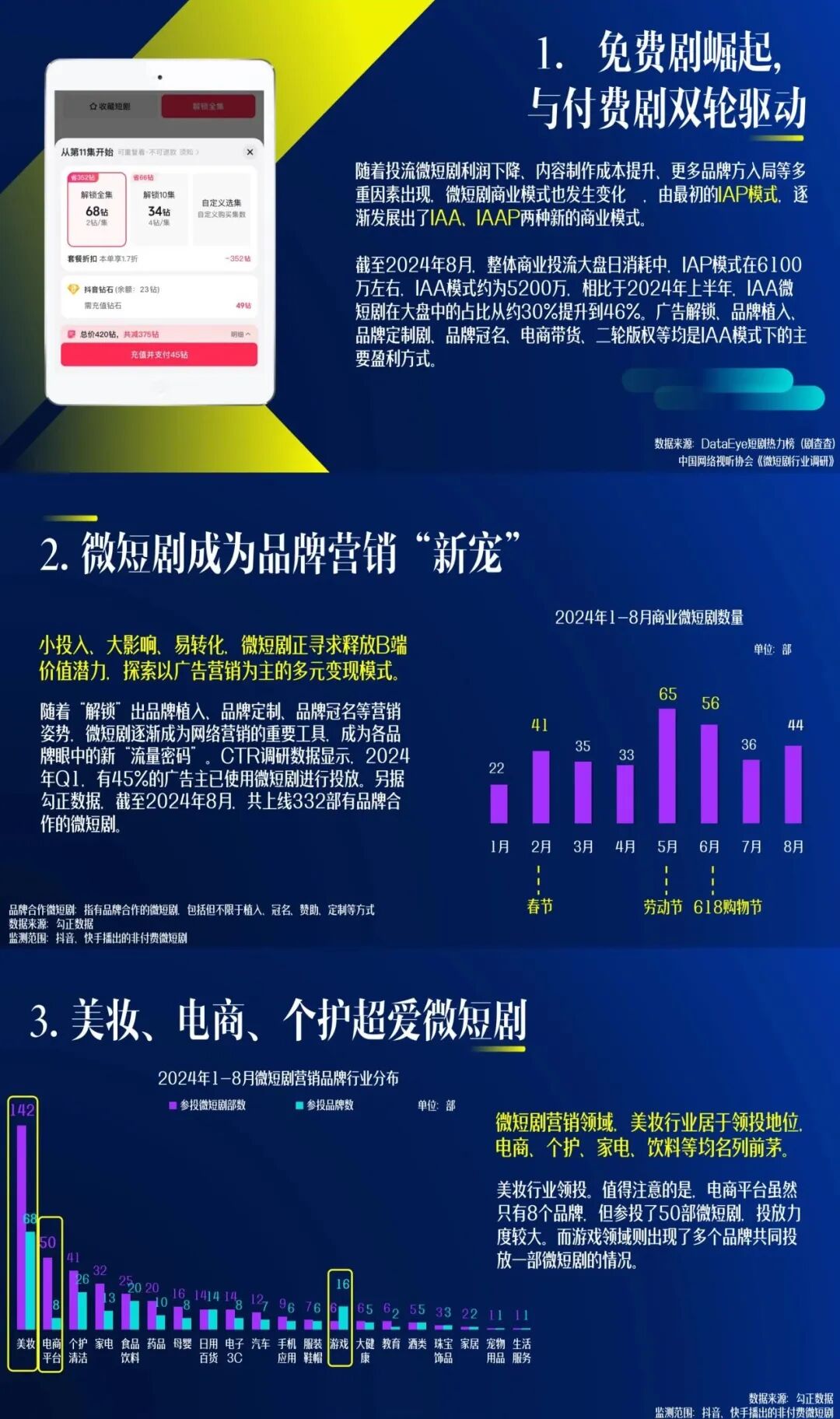 随着微短剧市场的成熟,品牌与短剧的合作模式日益多样化。从最初的简单植入,到如今的品牌定制剧、品牌冠名、电商带货等全方位合作,品牌在微短剧中的身影愈发频繁。截至 2024 年 8 月,众多行业的品牌纷纷入局,其中美妆、电商、3C / 家电、个护等行业表现尤为突出。这种合作模式的创新,为品牌营销带来了新的活力。