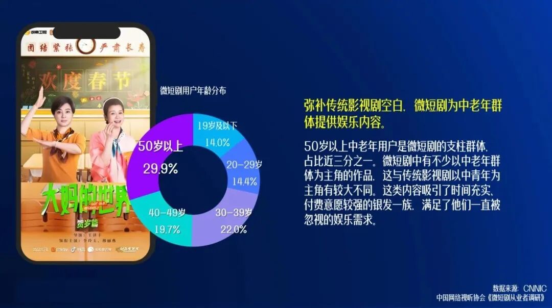 微短剧涵盖了都市、情感、古装、奇幻、悬疑等多种题材,满足了不同观众的兴趣爱好。其中,都市情感题材尤为受欢迎,而多元素融合的创新趋势也日益明显。在受众方面,微短剧吸引了各个年龄段的观众,尤其值得关注的是,50 岁以上中老年用户成为了微短剧的支柱群体,占比近三分之一。这些以中老年群体为主角的作品,弥补了传统影视剧在这一领域的空白,满足了银发一族长期被忽视的娱乐需求。