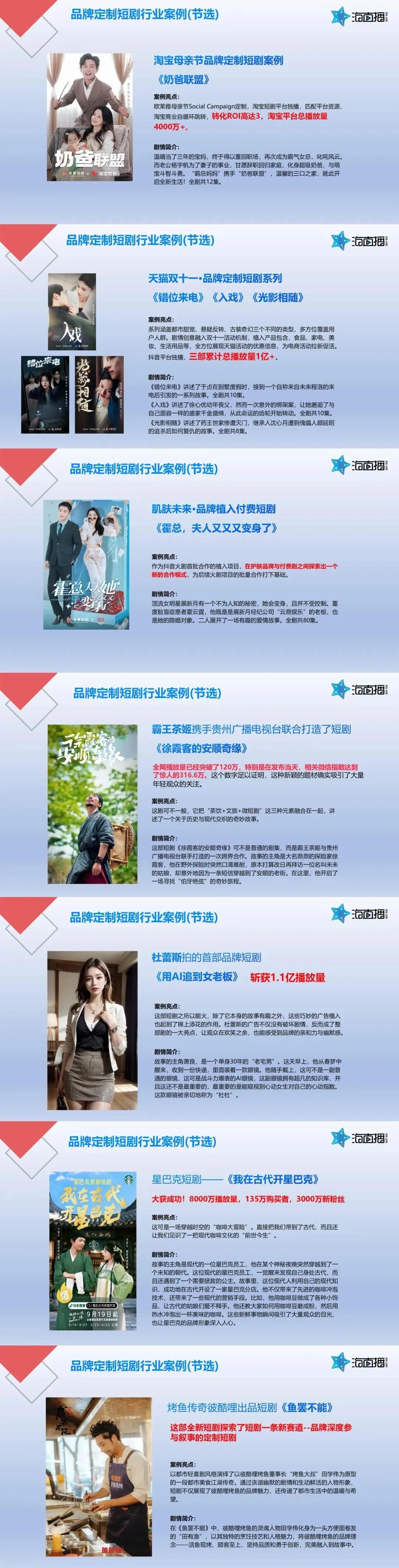 众多品牌通过与微短剧的合作,取得了显著的营销成果。例如,欧莱雅母亲节定制的《奶爸联盟》,在淘宝短剧平台独播,凭借巧妙的剧情植入和平台资源整合,实现了转化 ROI 高达 3,总播放量超 4000 万的优异成绩。天猫双十一推出的品牌定制短剧系列,涵盖都市甜宠、悬疑反转、古装奇幻等多种类型,通过剧情创意融入活动机制,全方位展示了产品优惠信息,三部累计总播放量达 1 亿 +,为电商活动成功拉新促活。这些成功案例充分证明了微短剧在品牌营销中的强大影响力,它能够以小投入带来大影响,助力品牌提升知名度、增加用户粘性,实现高效转化。