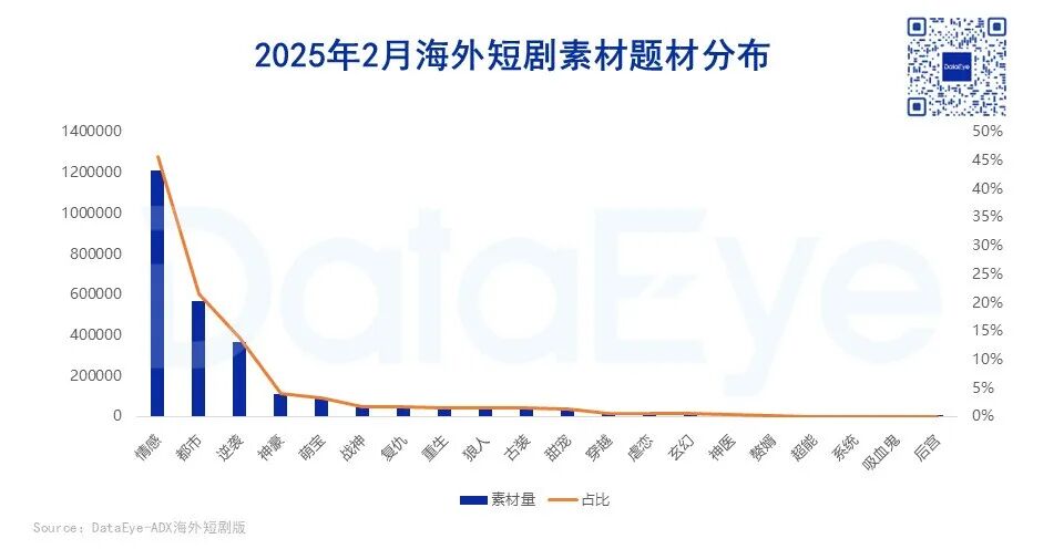 2025年2月数据显示,海外短剧内容仍以“女频”为主导,占比高达77%,男频仅占23%。细分题材中,情感类素材以超120万组(占比46%)居首,都市类以57万组(22%)紧随其后,逆袭类占比14%。可见,女性用户偏好的情感共鸣、都市生活与励志成长内容仍是市场核心驱动力。图片来源:DataEye短剧观察